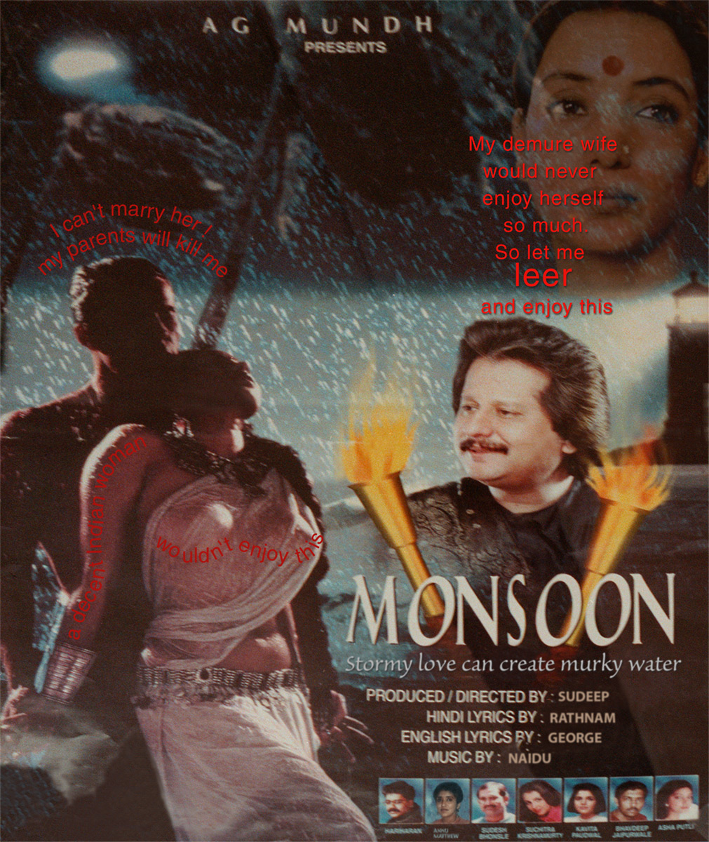 The digital portfolio, Bollywood Satirized, is a critical commentary on the societal expectations that I experienced as a woman growing up in India. To create this work, I start with Indian movie posters, a reflection of the popular culture and the melodrama of Indian life. The visual and aural presence of cinema in India is the result of the largest commercial film industry in the world that produces over eight hundred movies a year and reaches approximately 3.5 billion people. Most of the 2 billion dollar industry is concentrated in Bombay, (now called Mumbai) which is also called “Bollywood”.